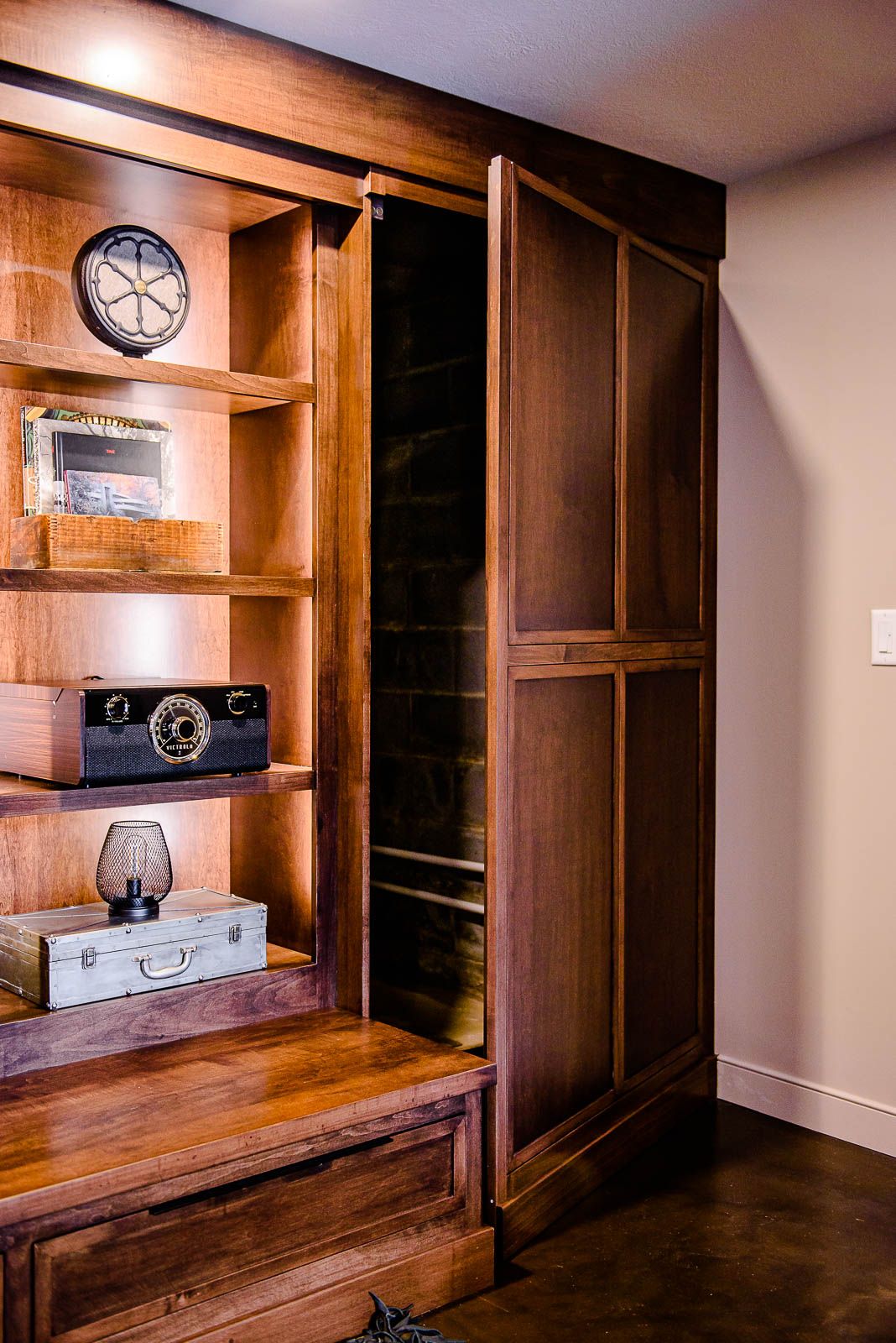 - Full custom entertainment center with electric fireplace, hidden door, and hidden TV