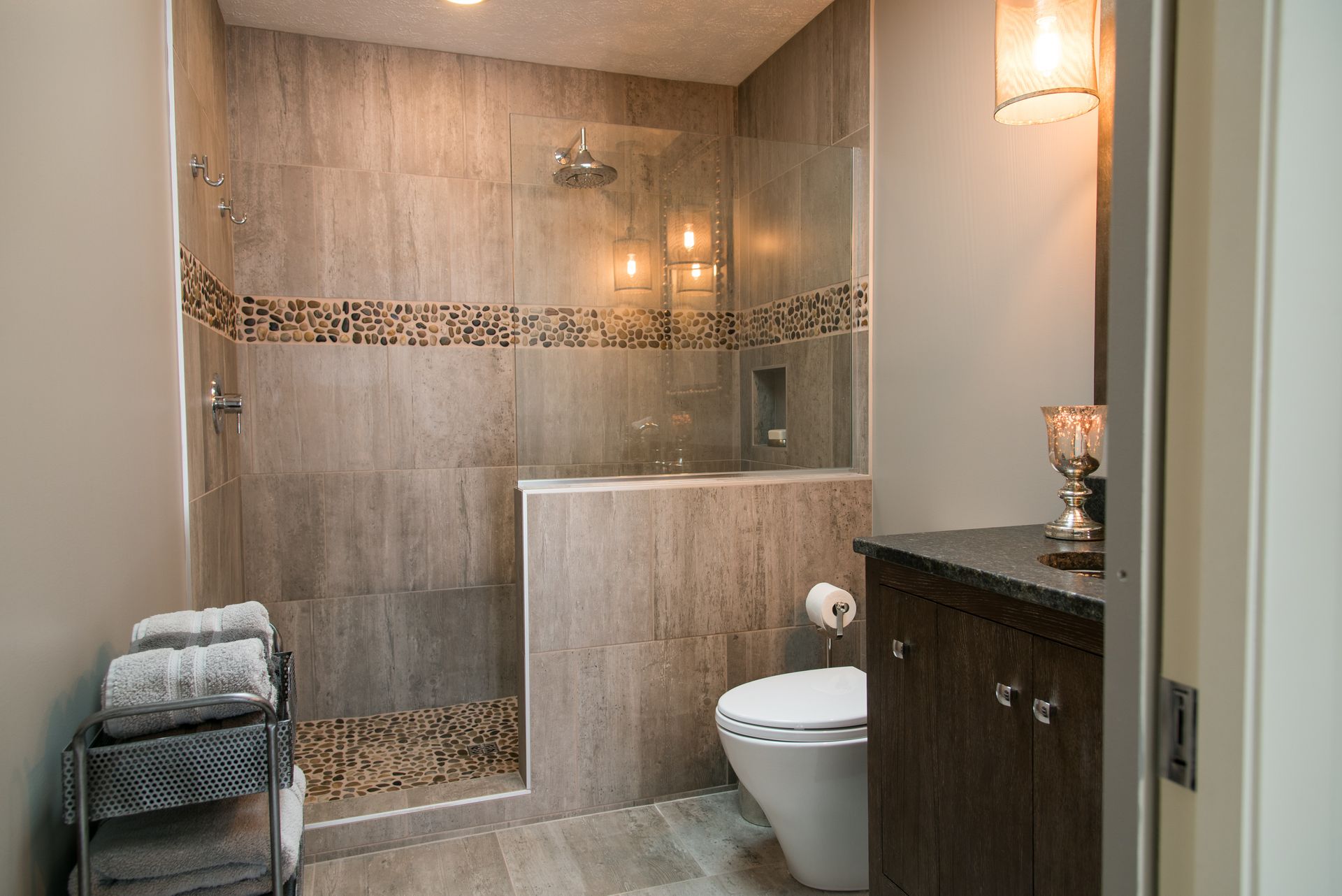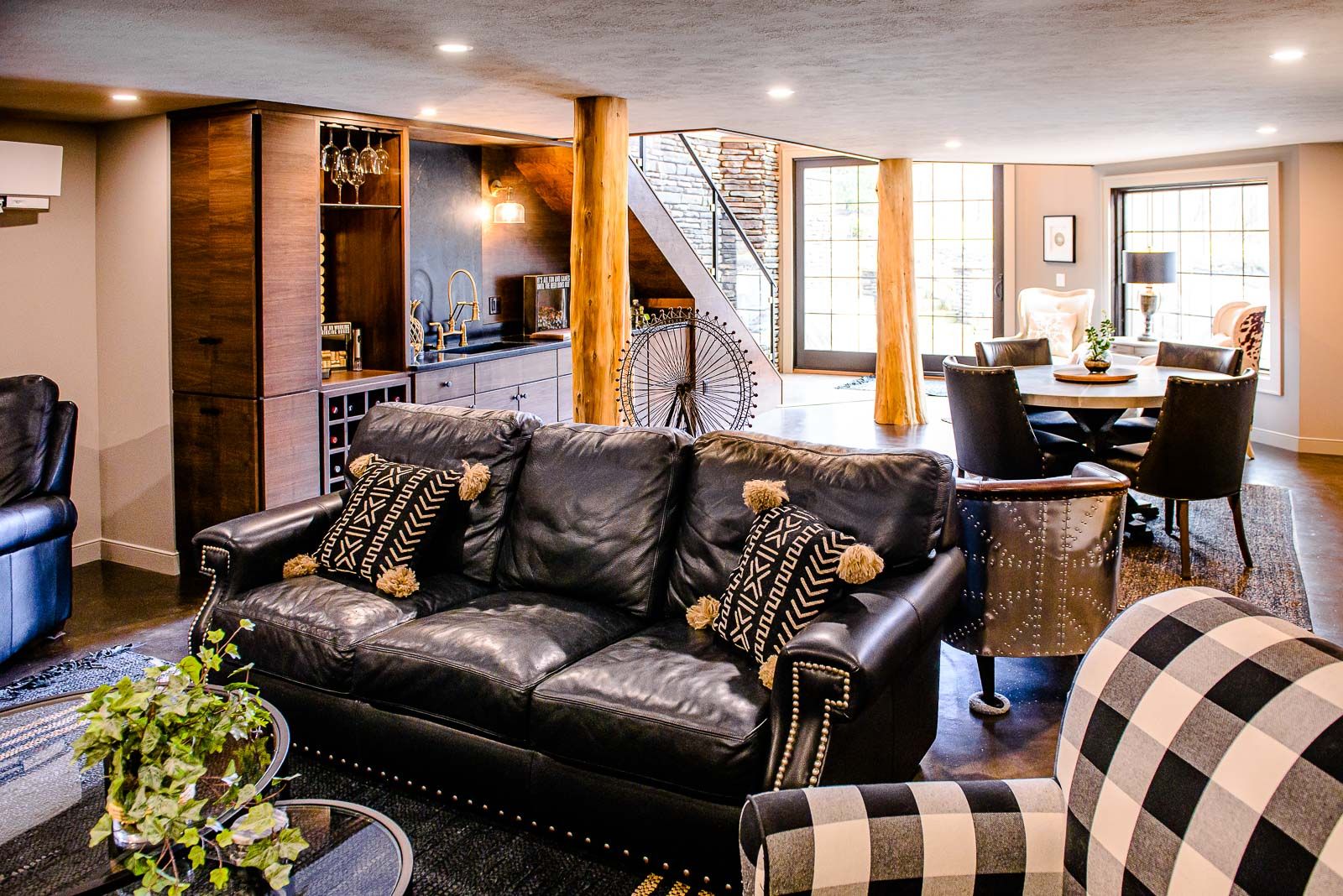 - Cozy, entertainment-focused basement with warm materials and custom details