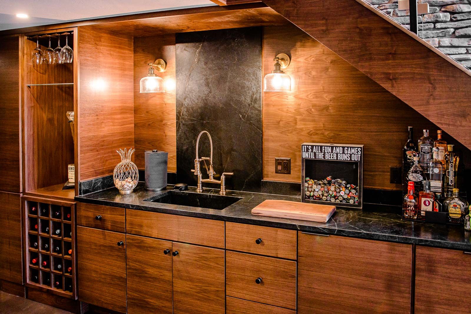 - Full custom bar with walnut veneer and paneled appliance fronts