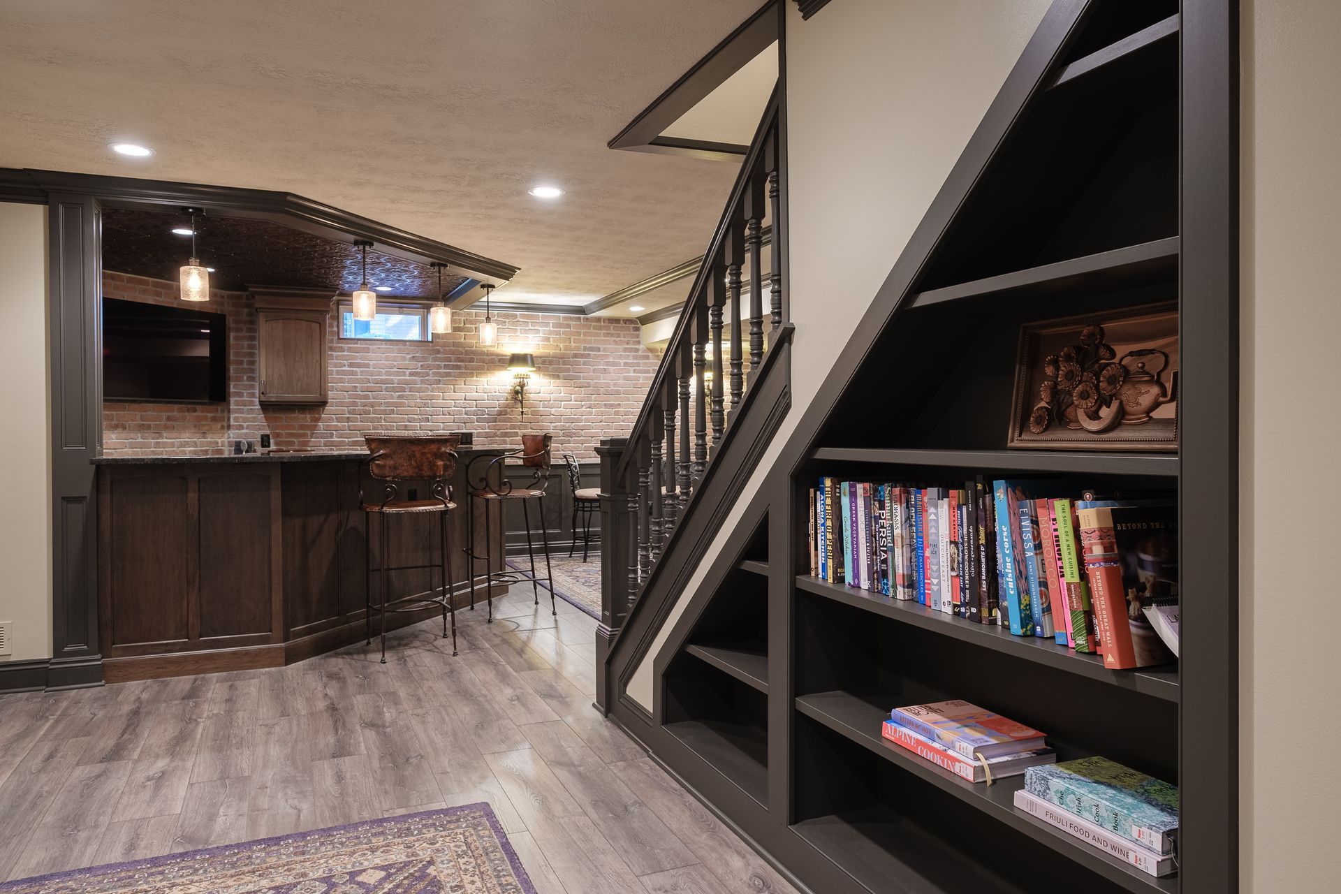 - Functional yet stylish basement with layered textures and architectural details