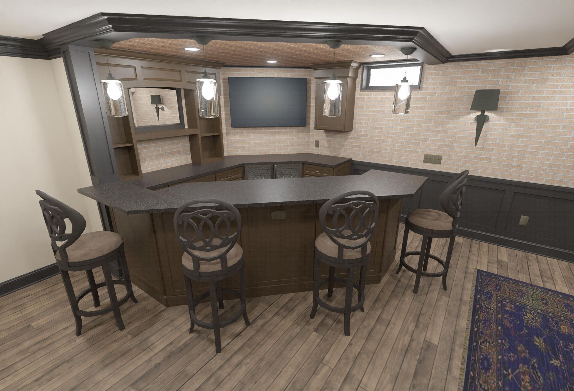 - Custom bar with brick walls, tin ceiling, and custom wainscoting